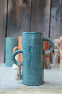 Zrobiony jest metodą z plastra z jasnej gliny. Ucha ozdobione są chwostami z lnu, który uprawiali moi pradziadkowie. Dlatego właśnie seria tych wazonów jest tak wyjątkowa. Poza bardzo ograniczoną ilością, która pozostała w motku, jest to wspomnienie rodzinnych historii i  tego skąd w Zbiorach ta potrzeba tworzenia.
