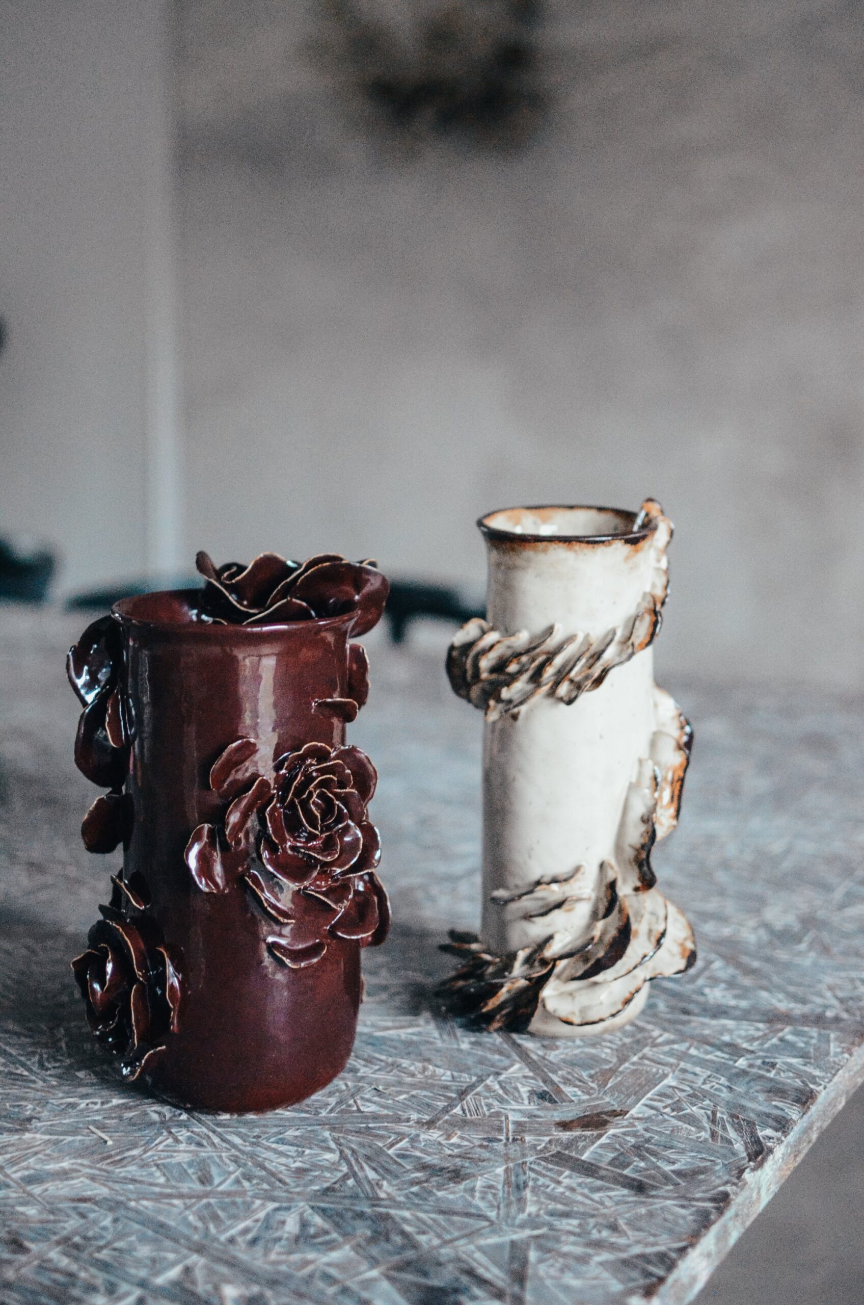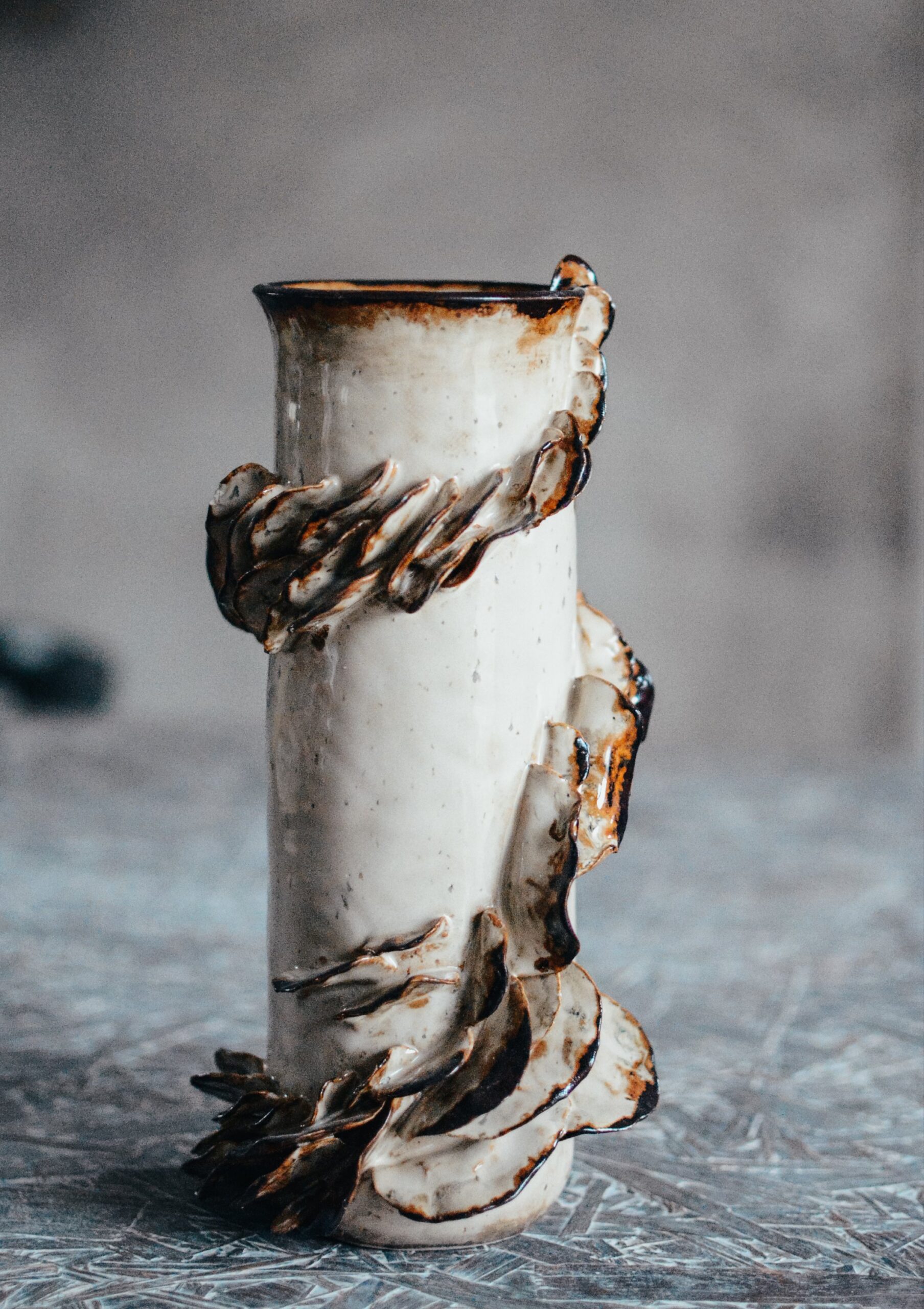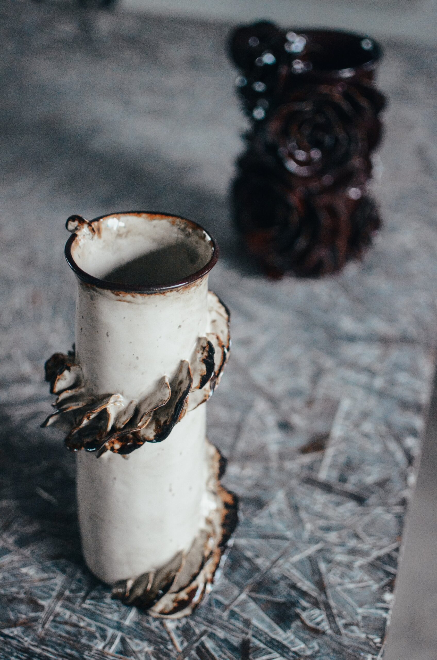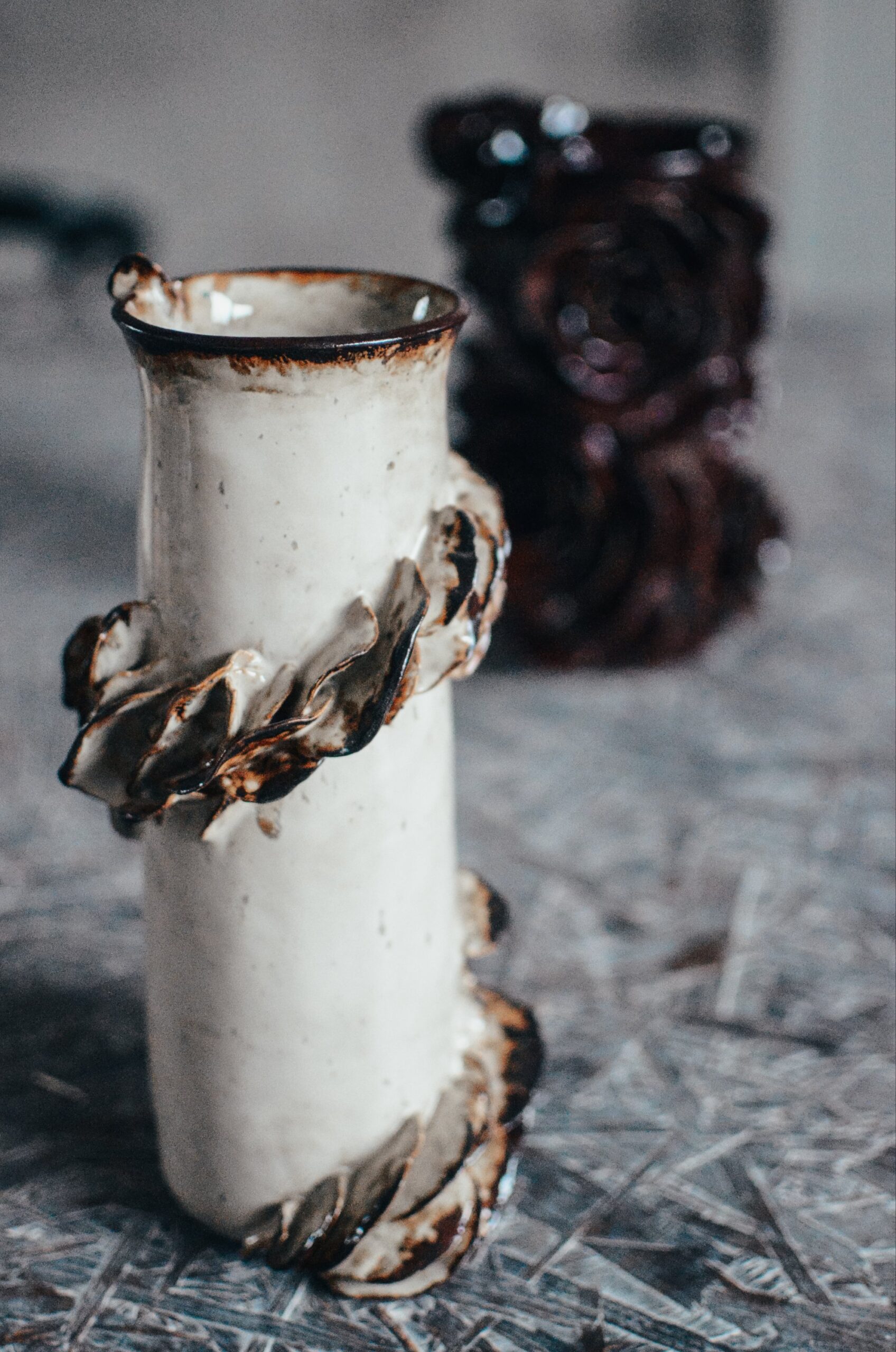 Jasna glina, beżowe perłowe szkliwo z bordowymi wstawkami, które spływa z krawędzi płatków podkreślając ich kształt.
