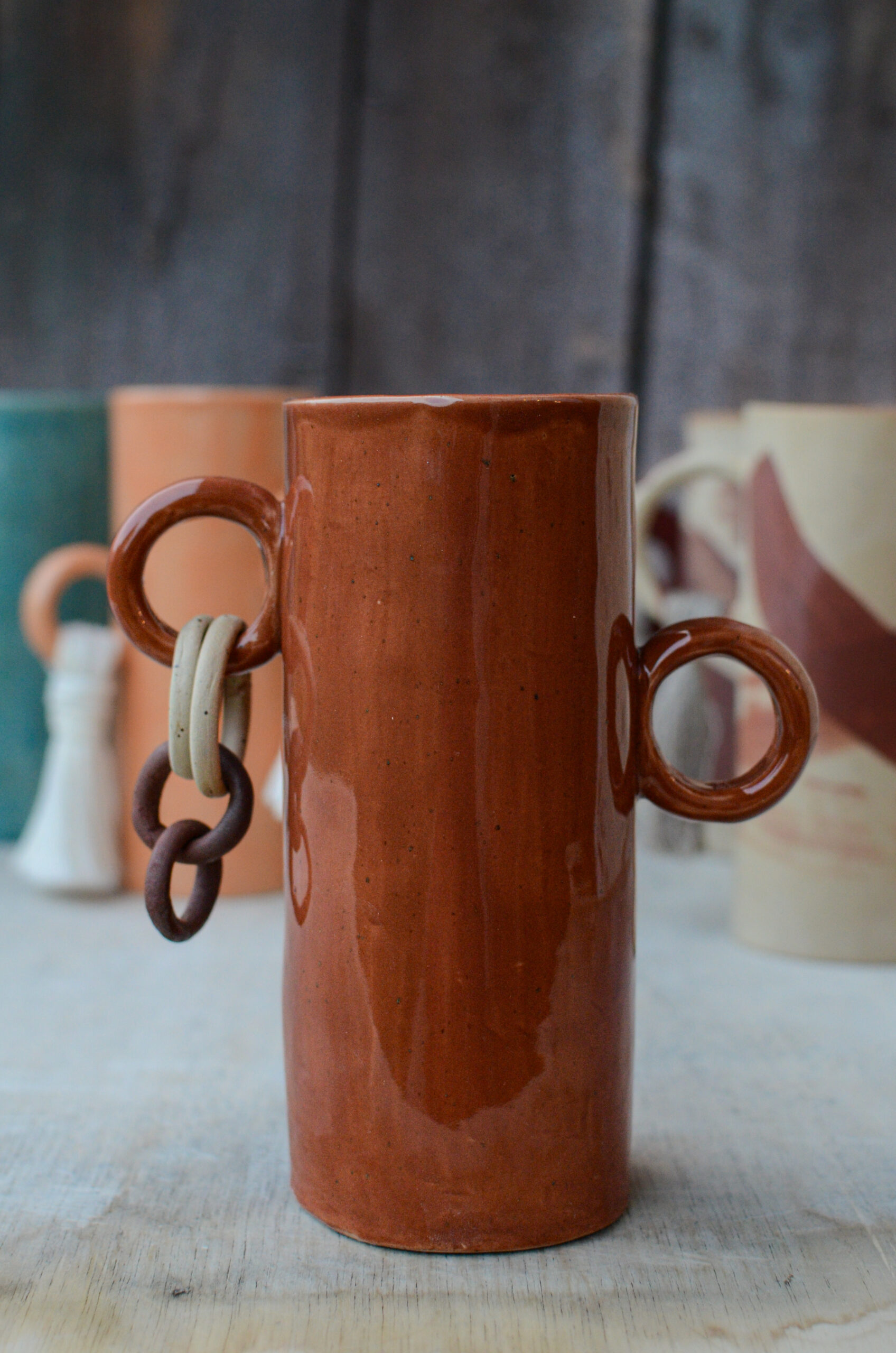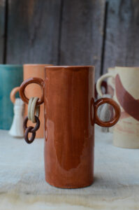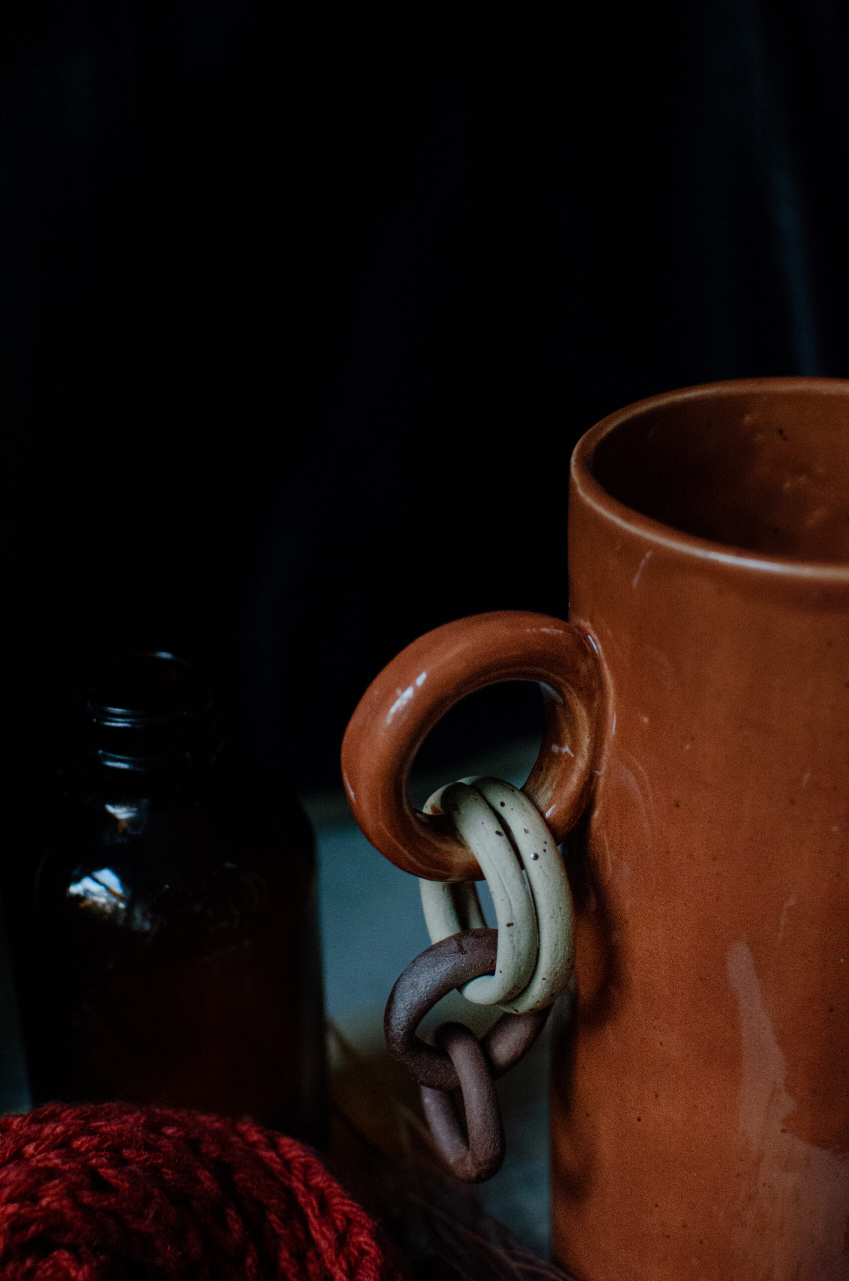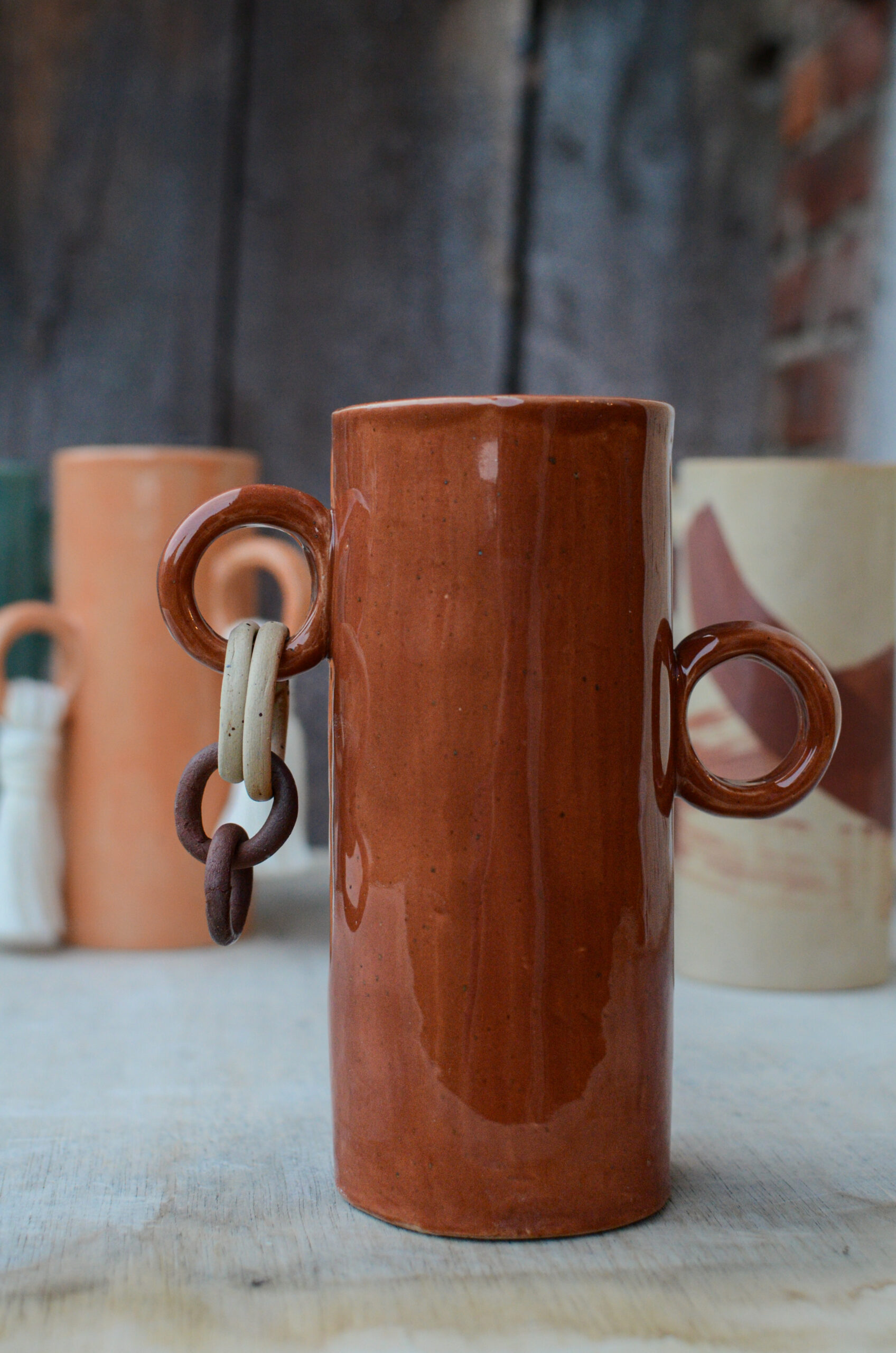 Zrobiony jest metodą z plastra z jasnej gliny. Na jednym uchu znajdziecie kółka, z innych kolorów gliny.