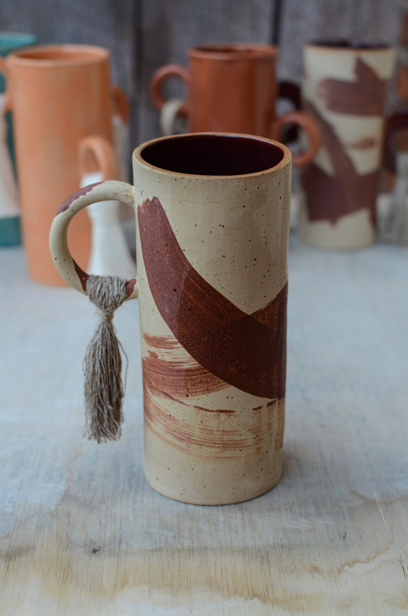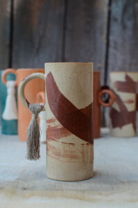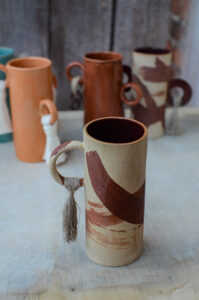 Zrobiony jest metodą z plastra z jasnej gliny. Ucho ozdobione jest chwostem z lnu, który uprawiali moi pradziadkowie. Dlatego właśnie seria tych wazonów jest tak wyjątkowa. Poza bardzo ograniczoną ilością, która pozostała w motku, jest to wspomnienie rodzinnych historii i tego skąd w Zbiorach ta potrzeba tworzenia.