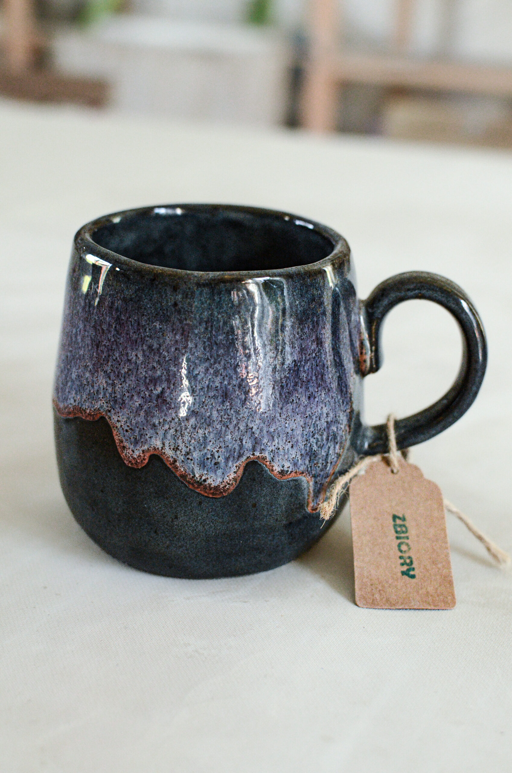 Kolor tego jesiennego kubka nie jest jednorodny. Spodnia warstwa szkliwa to ciemne, granatowe, błyszczące szkliwo, a na nim niczym rozlany spływający lukier nałożona jest warstwa ciemniejszego, mocno błyszczącego szkliwa w kolorze ciemniejszego różu i fioletu (pamiętajcie, że monitory i ustawienia ekranów, mogą przekłamywać kolory).