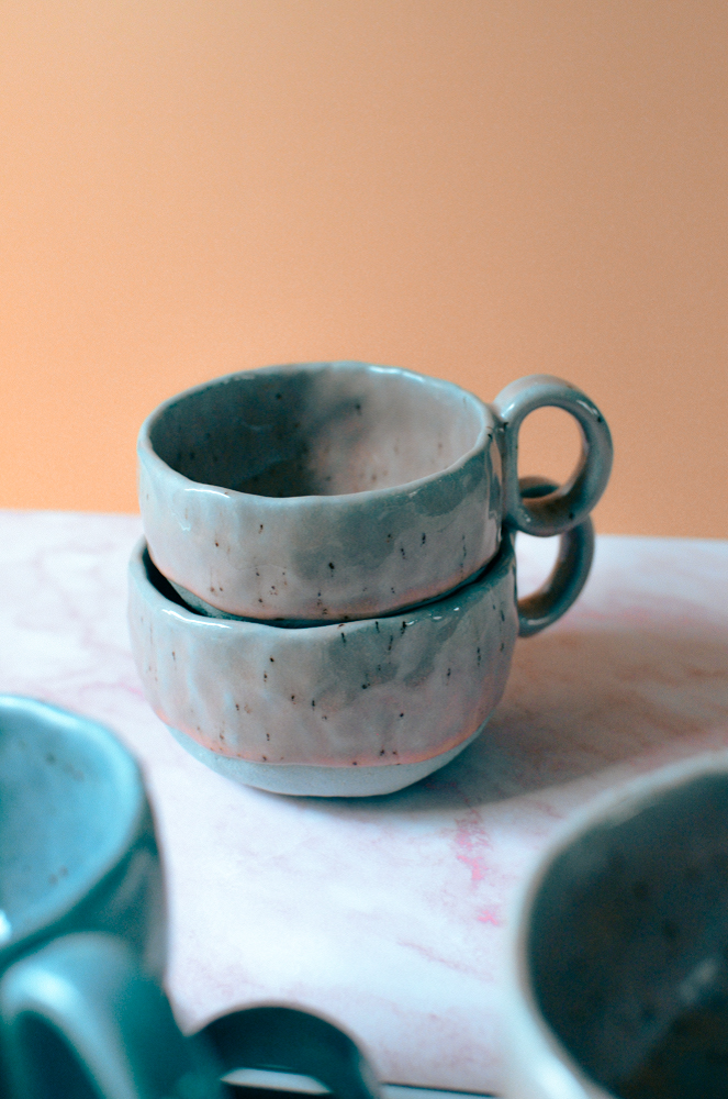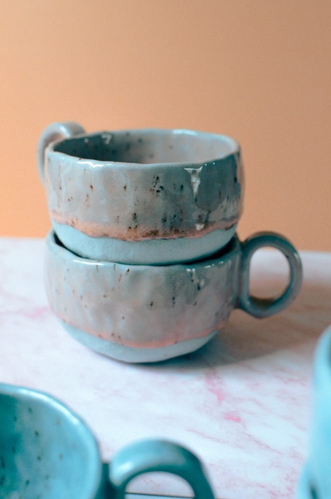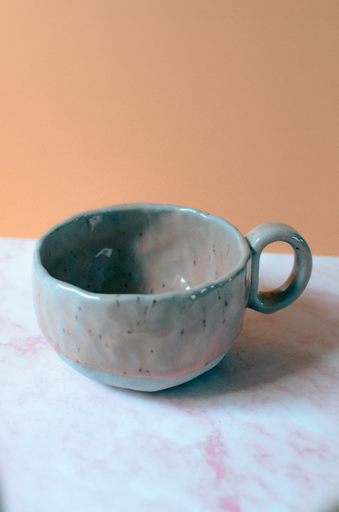 Błękitna filiżanka „lukrowana” różowym szkliwem. Ulepiona z niesamowicie niebieskiej gliny w sam raz na kawę z mlekiem lub herbatę.