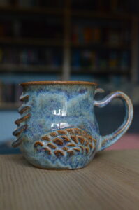 Kubek jest formowany ręcznie – mówiąc ręcznie mamy na myśli RĘCZNIE, na pieszo, z płata, sklejany i formowany jak rzeźba. Każdy element jest wypukły i tworzy efekt trójwymiarowości płaskorzeźby. Następnie kubek szkliwiony jest również ręcznie, pędzelkiem, przy użyciu kilku różnych szkliw. Na koniec wypalany jest w 1240ºC, co sprawia, że staje się trwały i w pełni użytkowy.