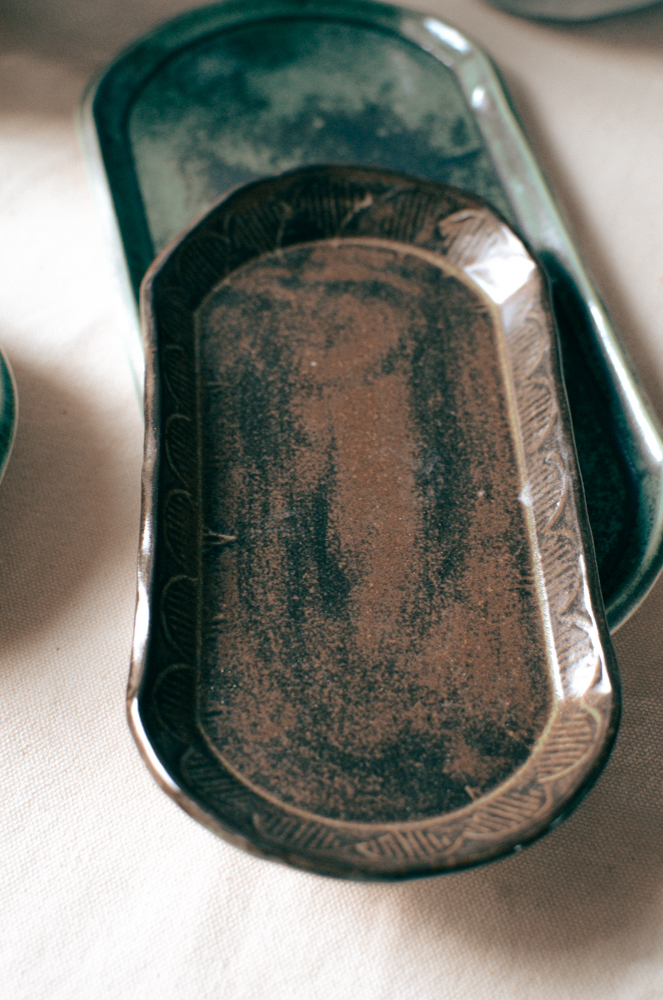 Szkliwiona czekoladowym szkliwem z delikatną fakturą własnoręcznie robionych stempli na krawędziach.